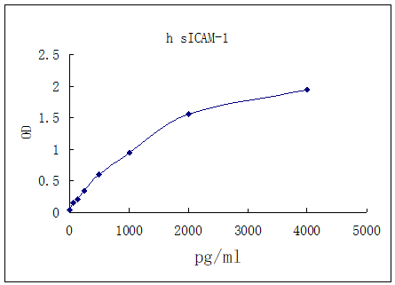 This assay employs the quantitative sandwich enzyme immunoassay technique. A monoclonal antibody specific for sICAM-1 has been pre-coated onto a microplate. Standards and samples are pipetted into the wells and any sICAM-1 present is bound by the immobilized antibody. Following incubation unbound samples are removed during a wash step, and then a detection antibody specific for sICAM-1 is added to the wells and binds to the combination of capture antibody- sICAM-1 in sample. Following a wash to remove any unbound combination, and enzyme conjugate is added to the wells. Following incubation and wash steps a substrate is added. A coloured product is formed in proportion to the amount of sICAM-1 present in the sample. The reaction is terminated by addition of acid and absorbance is measured at 450nm. A standard curve is prepared from seven sICAM-1 standard dilutions and sICAM-1 sample concentration determined.
