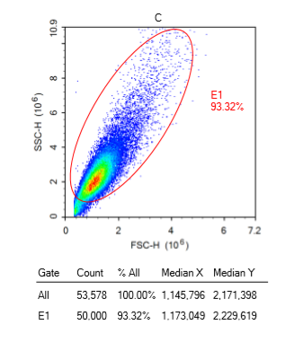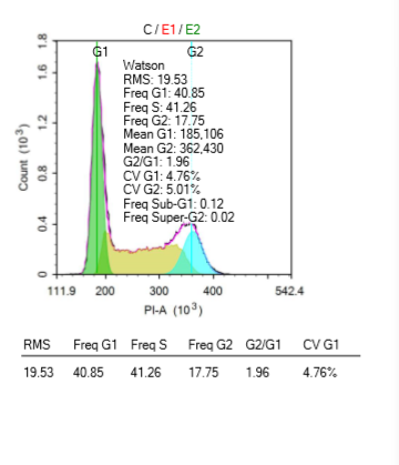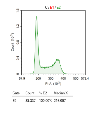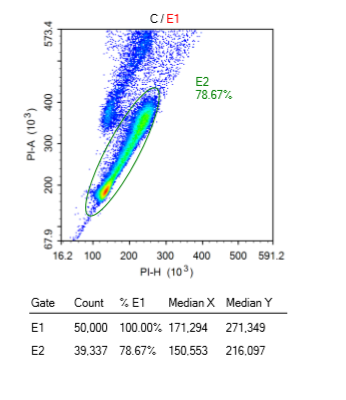 | 注意事项 | 1. 一般取细胞生长至覆盖率约为80%时(确保细胞未进入生长平台期)进行实验,但细胞生长密度过高,会出现接触抑制,可导致G2/M期缺失现象出现。 2. 贴壁细胞的消化时间要控制好,可边消化边观察,获得单个细胞,尽量避免DNA的降解,细胞消化固定后不可过度吹打,防止细胞碎片。 3. 为保证上机细胞数足够,染色前要进行细胞计数,保证细胞数与染料浓度匹配,避免样本管间差异较大。一般来说细胞浓度控制在2*105-2*106 个细胞/毫升。并确保细胞数和固定剂量和染料的浓度相匹配。 4. 使用离心机时,离心300~400g,且动作尽量轻柔,切记不要用力吹打细胞,尽量在4℃下操作,以免影响细胞状态。 5. 醇类固定后的样品可以在-20 °C存放几个星期,若短时间可置于4 °C避光保存。 6. 上机前,细胞过200目筛网,尽量除去细胞团。 7. 上样速度不宜过快,细胞浓度不宜过高,一般选择低速收细胞, 200个细胞/秒为佳。 8. 收细胞目的细胞20000个以上的目的细胞。 见下图E2门: 1. DNA染料,尤其是PI,具有较强的粘性。样本上机检测之后,应遵照仪器说明书仔细清洗流式细胞仪,以免对下一位操作者结果造成影响 。 2. 通过电压脉冲信号的宽度和面积区别实体组织标本中的粘连细胞群体,最大程度的减少粘连细胞带来的假阳性结果。 |